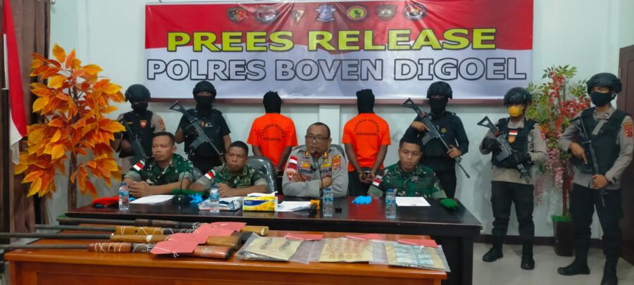 Kedua tersangka berinisial MK dan AH diamankan di pelabuhan kecil Iwot kampung Sokanggo Distrik Mandobo mereka merupakan penduduk dari Kab. Yahukimo yang melintas di Boven Digoel setelah melakukan transaksi jual beli Senjata dari PNG yang akan di bawa ke perbatasan Kab.Yahukimo Kab. Pegunungan Bintang melalui sungai.
