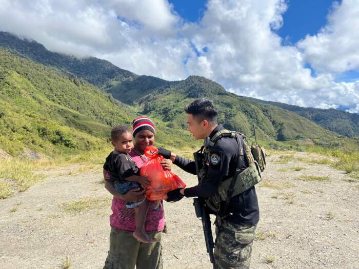 Puncak Jaya — Personel Satgas Operasi Damai Cartenz-2025 melaksanakan kegiatan humanis dengan membagikan bantuan sembako kepada mama-mama Papua serta makanan ringan untuk anak-anak di Kampung Wuyuneri, Distrik Mulia, Kabupaten Puncak Jaya, Minggu (11/5).