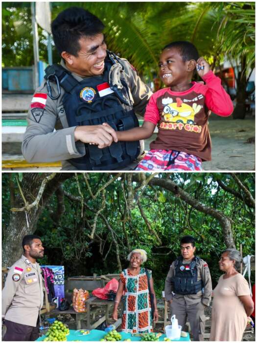 At Hecnuk Beach, the atmosphere quickly turned warm and welcoming. Children ran excitedly to greet the officers, some inviting them to play, others giggling shyly when spoken to. Mothers and community leaders welcomed them with open arms, engaging in light conversation about their hopes for a more peaceful Papua.