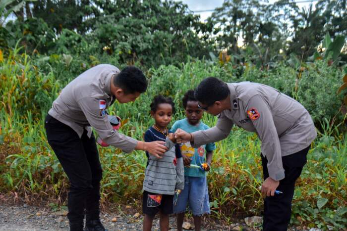 Dua personel Satgas Humas Posko Timika tersebut adalah Briptu Yoga Yandika, S.H. dan Bripda M. Adharmansyah Rumakat. Keduanya tampil tulus dan membaur bersama warga serta menunjukkan wajah Polri yang ramah, peduli, dan siap melayani masyarakat.