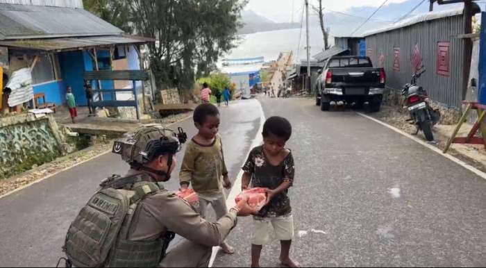 Enarotali, East Paniai – The 80th Anniversary of the Brigade Mobile Corps in Paniai Regency took place with warmth. The Task Force Operation Peace Cartenz of the Paniai Sector carries out social service activities by distributing food packages to the community along Jl. Aikai went to the pier, Friday (11/14/2025).